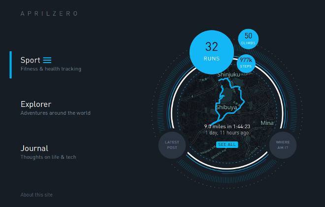 Reunindo informações de aplicativos utilizados no smartphone – entre eles Nike +, Foursquare e Move -, Sharma criou o April Zero, um site que mostra em tempo real o que acontece em sua vida.