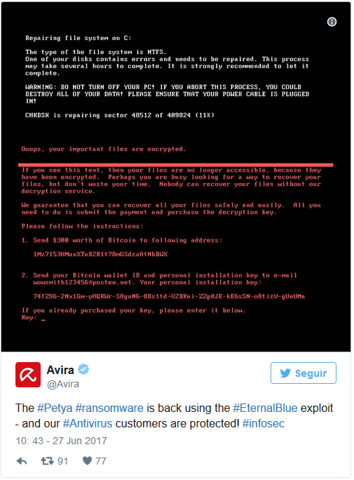 Ainda não se sabe ao certo qual é exatamente o tipo de ransomware responsável por esse ataque. Um pesquisador da Kaspersky Lab identificou-o como o vírus Petrwrap, uma versão do ransmoware Petya que foi identificada pela primeira vez em março. Segundo a Avira, o Petrwrap está explorando a mesma vulnerabilidade de SMB do Windows que o WannaCry explorava para se espalhar. Os tweets de pesquisadores das duas empresas podem ser vistos abaixo: