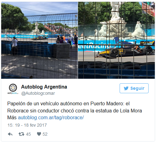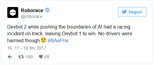 No último sábado, 18, a associação de carros autônomos Roborace realizou a sua primeira disputa entre carros elétricos de corrida sem motoristas, em um circuito de rua em Buenos Aires. Participaram dela dois veículos de teste chamados de “DevBots”, mas a corrida logo na primeira volta quando eles se envolveram em um acidente.