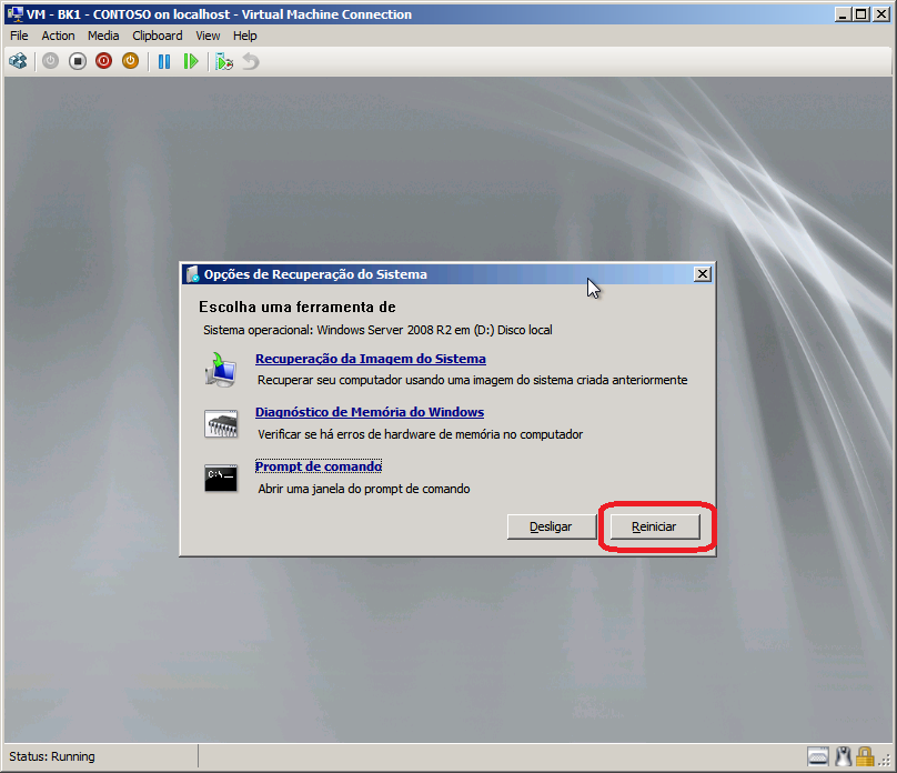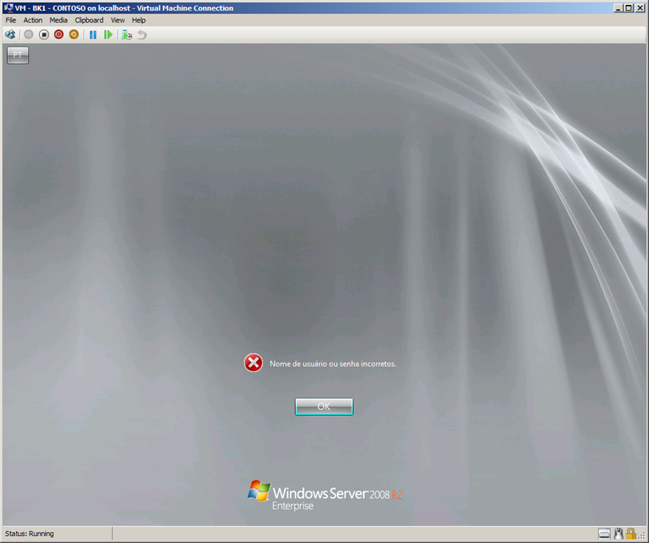 Em nosso exemplo estamos utilizando o Hyper-V R2 utilizando uma VM com Windows Server 2008 R2 e conforme a mensagens abaixo não possuímos a senha do administrador:  Nome de usuário ou senha incorreta.