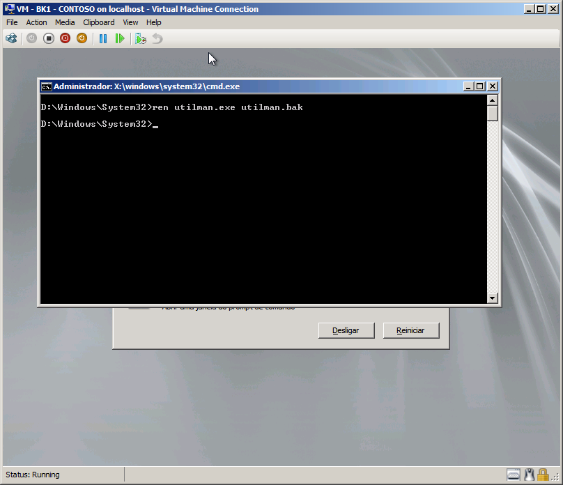 •  Agora vamos renomear o utilitário conhecido como Utilman, através do seguinte comando:  “ren  utilman.exe   utilman.bak “
