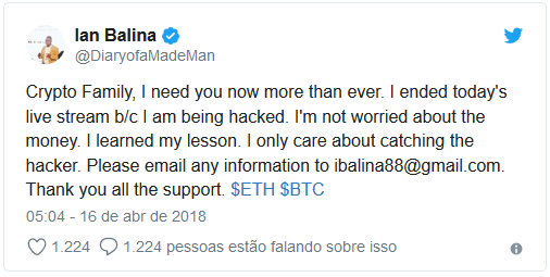 Ian Balina, um youtuber que dedicava seu canal a falar sobre criptomoedas e ICOs, foi hackeado ontem enquanto fazia uma transmissão ao vivo pela plataforma de vídeos do Google. No total, de acordo com o The Next Web, Balina perdeu mais de US$ 2 milhões em tokens virtuais.